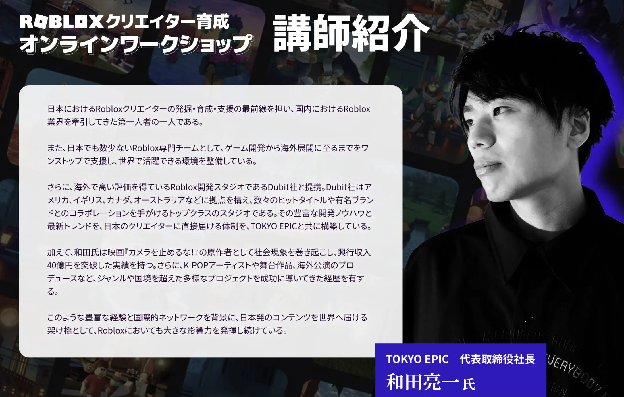 Robloxデジタルクリエイターズアカデミーはカメラを止めるな!の共同原作の和田亮一氏が代表を務める『TOKYO EPIC』が監修を務めるようです。