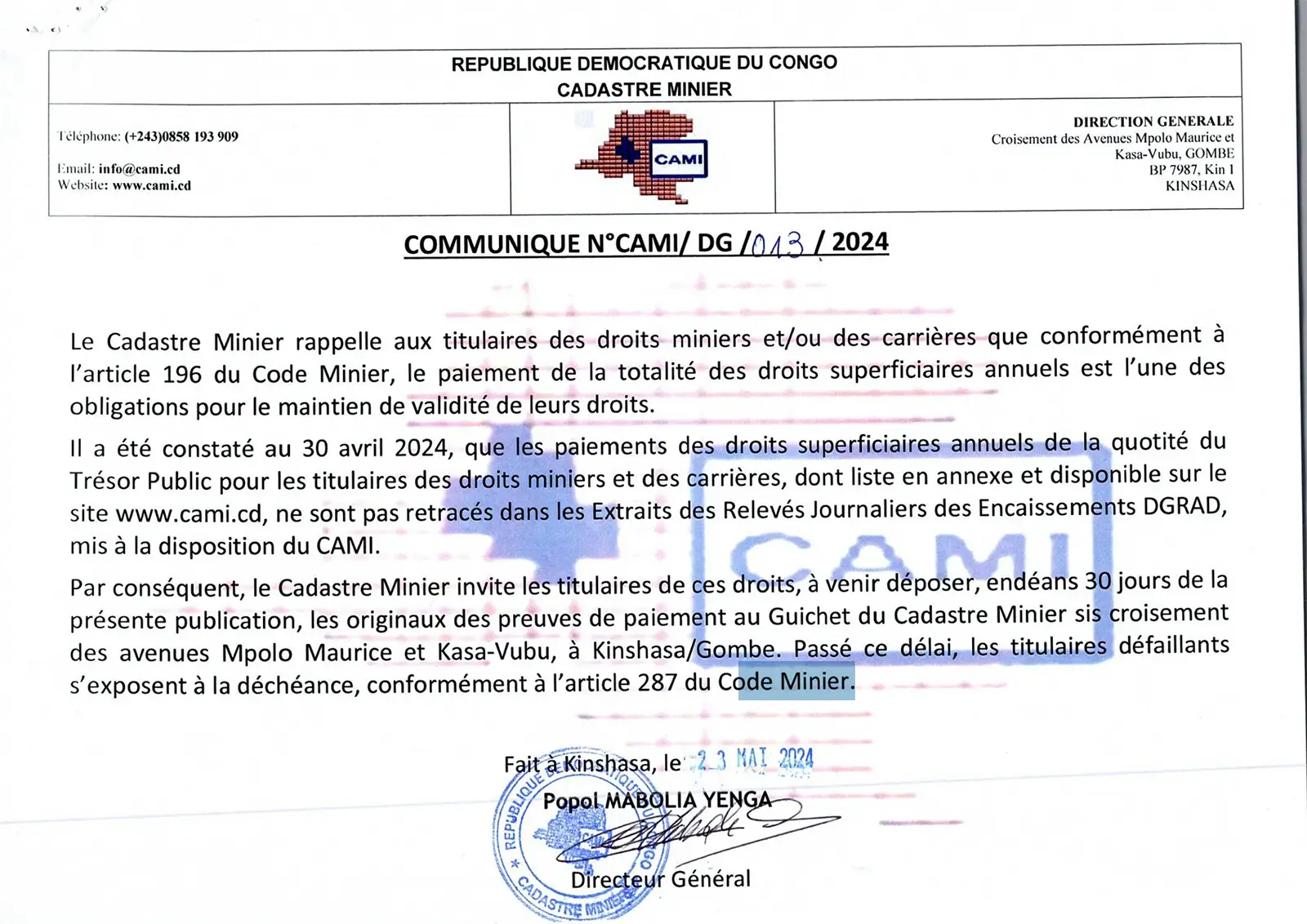 鉱業権および採石場権の保有者(別添リスト、ウェブサイトwww.cami.cd で閲覧可能)の年間地役権料の支払いが、DGRADの毎日の収入明細書の抜粋(CAMIが閲覧可能)に記録されていないことが確認されました。したがって、鉱業登記所は、これらの権利の保有者に対し、本公告から30日以内に、キンシャサ/ゴンベにあるMpolo Maurice通りとKasa-Vubu通りの交差点にある鉱業登記所の窓口に、支払証明書の原本を提出するよう要請します。この期限を過ぎた場合、権利者は鉱業法第287条に基づき権利を喪失する可能性があります。